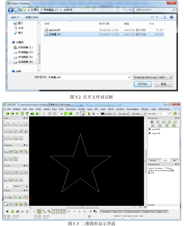 进入该 CAD/CAM 一体化软件运行的界面后,零件图形可以自定义绘制,可绘制的图形实体有点、直线、圆弧、圆、polyline、polygon、文本(text)等;零件图形也可以从通用的 CAD 软件生成的二维图形文件中读取,如.dxf 文件。如果是读取其它的 CAD 软件生成的二维图形文件,操作的具体流程如下:首先选择菜单栏中的“File”菜单中的子按钮“Open…”,弹出如图 5.2 所示的对话框,然后选择.dxf 后缀名的文件,最后点击打开即可。其中.dxf 文件显示的图形如图 5.3 的界面所示。在自定义零件图形或是从其它 CAD 软件读取出的图形时,有时图形达不到设计或是加工的要求,这就需要对图形进行编辑修改的操作。在本课题开发的 CAD/CAM 一体化软件中,编辑修改的命令主要有移动、复制、旋转、镜像、偏置、倒圆角、倒角、填充、阵列等。这些编辑修改命令的具体操作大部分是一样的,有一些操作会弹出对话框,需要用户自己输入或选择相应的参数进行下一步的操作,如图 5.4 所示。