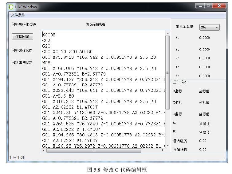 先单击“连接网络按钮”,使上位机与下位机网络连接畅通,然后单击“文件操作”中的“向下位机发送文件”,弹出打开的对话框,选择文件,点击打开 即可,就将上位机中生成的 代码文件发送到下位机,直接驱动机床轴的运动。如图 5.8 所示界面为修改从上位机或是下位机中获取的 代码以满足加工要求。