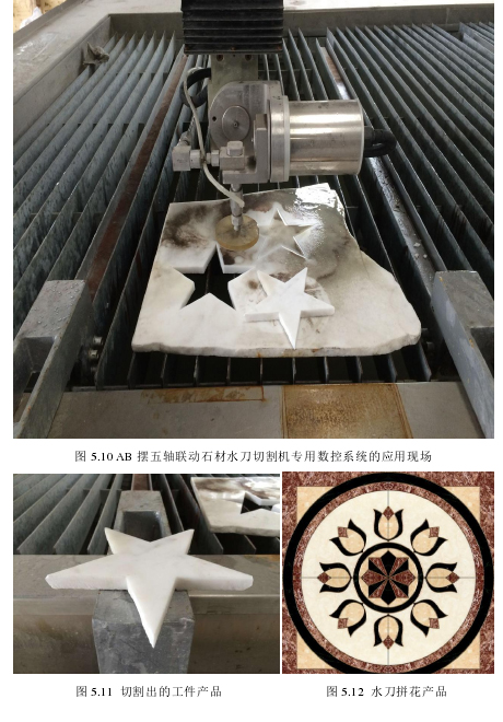 摆五轴联动数控水刀切割机床上应用验证。如图 5.9 为 CAD/CAM 一体化的专用数控系统实验平台的测试现场,如图 5.10 是 AB 摆五轴联动石材水刀切割专用数控系统机床的应用现场,如图 5.11 是 AB 摆五轴联动石材水刀切割专用数控机床切割出的工件石材,其中边缘偏角 为 2.5°,如图 5.12 是该正能石材机床厂石材水刀拼花产品。经现场对加工出的工件的测试验证,本文开发的 CAD/CAM 一体化的五轴联动水刀切割专用数控系统目前已经完成了图形实体属性添加,及生成五轴数控代码等功能,并且取得了良好的效果。