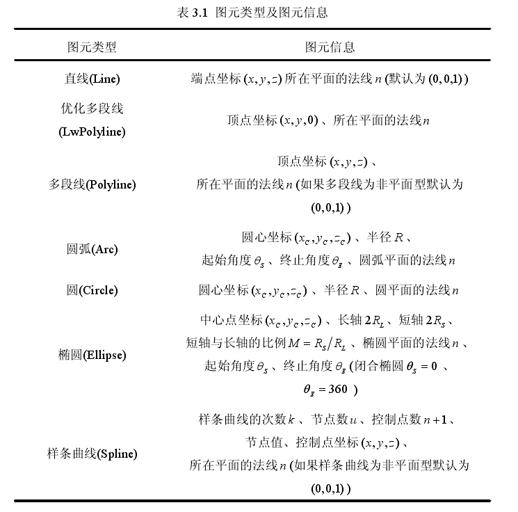表3.1中,优化多段线(LwPolyline)为平面多段线其Z坐标值恒为零;多段线(Polyline)为三维多段线;样条曲线(Spline)为三维非均匀有理B样条曲线即NURBS曲线;其他图元皆为三维图形。