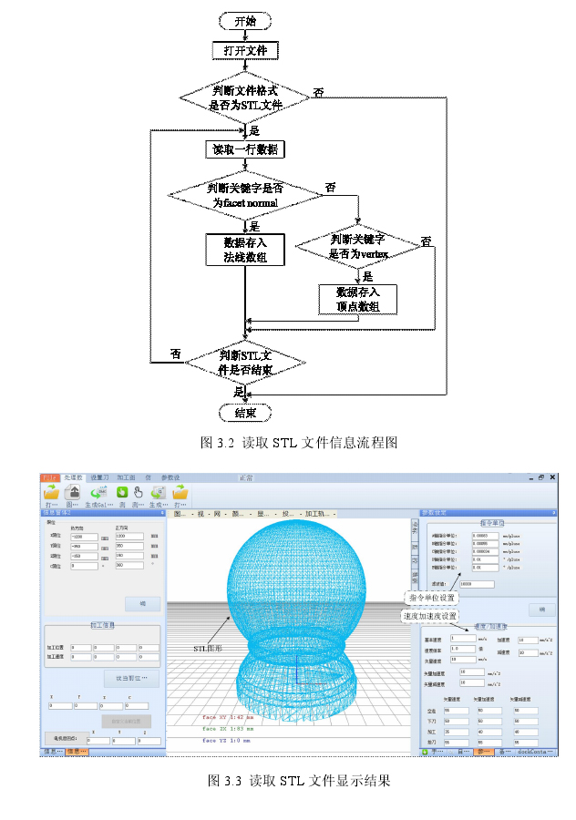 从STL文件的存储实例看出:法线和顶点的坐标信息是按行存储,且每行前面都有对应的标识(如facet normal, vertex)。因此采用逐行读取的方法编程读取STL文件中的法线坐标和顶点坐标,程序流程图如图3.2所示,读取文件的显示结果如图3.3所示。