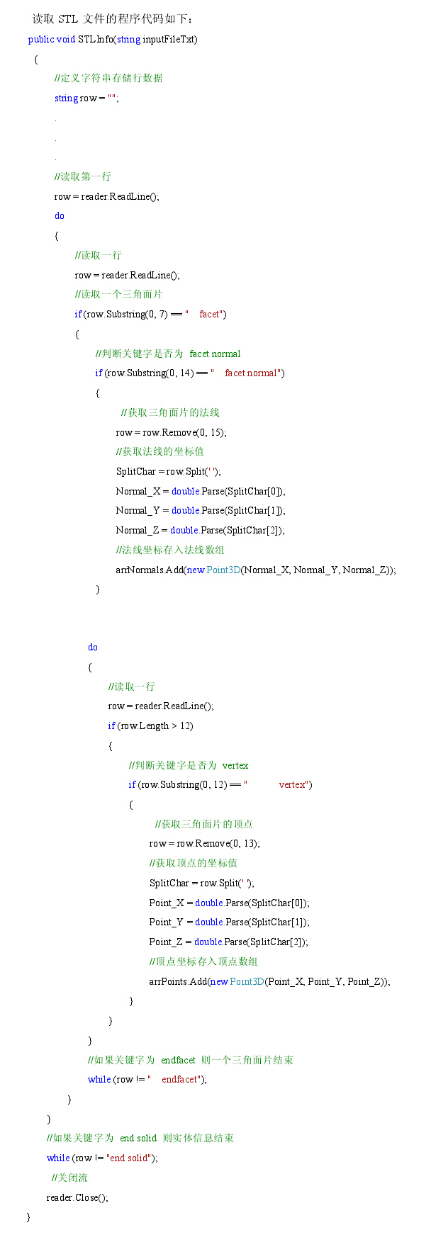 其中,solid(固体)表示实体的开始;facet normal(小平面法线)表示一个三角面片的开始,其后面存储的是一个三角面片单位外法线坐标;outer loop(外环)表示顶点坐标开始,随后为该三角面片的顶点,三个vertex(顶点)其后按右手原则分别存储了该三角面片的三个顶点坐标,endloop表示顶点结束;endfacet表示一个三角面片结束;endsolid表示实体结束。