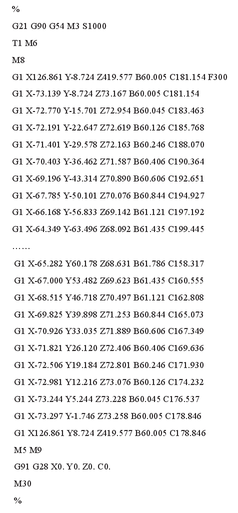 G代码是现有数控机床广泛使用的一种数控加工代码,较为流行的CAM软件如UG, pro/e, MasterCAM等都支持G代码的输出。本章的仿真部分将用到.NC文件的G代码进行加工仿真,需先生成相应的.NC文件。G代码支持直线插补(G01)和圆弧插补(G02 , G03,第四章中已对各种曲线进行了数据点密化,因此,本文使用G代码的直线插补指令G01并用C#语言编程自动生成.NC文件。 将第5.1节中所得B, C轴的旋转角度,第5.2节中所得偏置后的点坐标和5.3节中进退刀数据用G01指令重构。再加上公英制代码(G20, G21)、工件坐标系代码(G54)、刀具选择代码(T)、主轴正反转及停止代码(M3, M4, MS),主轴转速设定代码(S)、进给速度设定代码(F)等,即可生成完整的数控加工G代码并保存成.NC文件,生成的G代码实例如下: