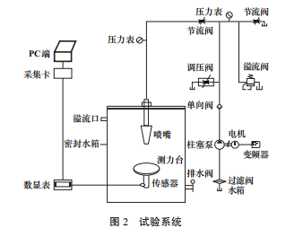 为研究高压水射流与高压磨料射流对刚壁冲击力的分布规律,设计了高压水射流测力系统,整个系统包括高压射流系统、测力系统与电控系统3个部分。高压射流系统由高压栓塞泵、水箱、过滤器、调节阀、单向阀、压力表、节流阀、溢流阀、喷头等组成:测力系统由测力台、测力传感器、数显表、采集卡、PC端等组成,电控系统主要是通过变频器对电机实施变频控制。试验时,把设置靶距参数,选定测力台,开启高压射流系统,通过变频器调节电机转速控制系统水压至设定值,由PC端采集记录工作台下的冲击力值。测力台承受射流冲击的面积为圆形,由N个圆盘构成,按照面积从小到大进行编号,其直径为 7(N+1)mm,N∈(1,2…21),由标准1kg砝码对照数显表进行标定,利用两相邻圆盘的射流冲击力的差值,确定其各阶段冲击力值。