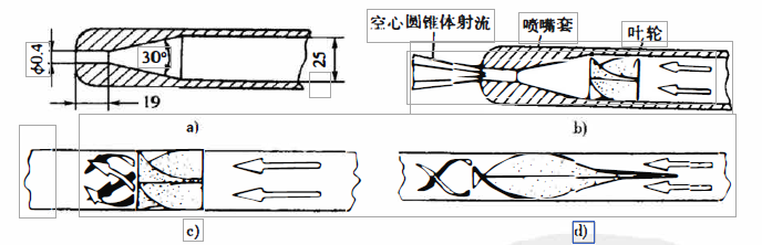 锥形水射流钻孔的喷嘴是在对普通喷嘴添加了一个叶轮改进后得到的,由叶轮进口段、锥形收缩段及直线出门段三段组成,后两段依据经典理论选取参数。 为使该喷嘴在土层内连续钻孔时钻孔的孔径为喷嘴直径的3~6倍,喷嘴前面要连接一根进水管,且管 中水的流速应比喷嘴出口处水的流速小一个数量级。 使用时,进水管 的水通过叶轮变成在管道内绕管道轴线旋转的水流,该水流进入锥形收缩段后被加速至390m/s,随后进入长度为2~3倍喷嘴直径的直线 段部分,在出口处流体由于仍然保持旋转状态从而产生一个能往前延伸的空心圆锥体射流18)。空心圆锥体射流的能量集中在圆锥体外层的周边,当喷嘴进入土 层后,被圈在空心圆锥体内的部分就能被除去。 试验表明,当流体压力很低时(小于O. 7MPa),水在空心锥周边上的冲击力也足以穿透土体。 当水流压力处千工作压力时,空心锥体变成不连续的液滴,此时射流与材料的作用机理土要为液滴的冲击作用。 射流作用于材料表面的滞止压力随靶距、喷嘴直径的增加呈指数形式衰减,但钻孔直径与靶距基本上呈线性关系。 描杆是地下采矿的常用支护设备,采用高压水射流钻描杆孔, 钻杆不需承受很商的推力和扭矩,铀杆孔的直径就能减小到 25. 4mm或更小( 一般的机械钻进达不到此目标,钻出的孔径都较大),树脂描杆直径就可减小。 基于此,就有了水射流铀杆孔钻机该钻机主要由高压水发生系统、钻杆、钻头和机架等部件组成。高压水发生系统可提供流量1. 9L/m血压力280MPa的高压 水流,功率22kW。 钻头体山工具钢制成,其上装有碳化合金刀片和三个喷嘴,并开有冲洗液输出 喷嘴锥角13°,直径 o. 203~0. 229mm,直线段长度为2~3倍喷嘴直径。采用与旋转轴线成 15°角的羊只喷嘴,在抗压强度为 147MPa的砂岩中,每分钟可钻进 3m;但若钻进耐磨蚀的岩石或控制钻孔尺寸,喷嘴数噩就需增加为三个。 钻孔的孔壁较粗糙,这对树脂与岩石的紧密结合有利,但钻孔尺寸必须控制,钻头体上的合金刀片就是用来保证孔尺寸保持在一定范围内的。 该钻机钻杆由两根同心金属管组成。 内管壁厚,用于输送高压水并传递钻孔所需的推力和扭矩;外管壁薄并固定,主要用来输送冲洗岩屑用的低压冲洗液,保护旋转的内 管不致磨损,并能提供附加的抗弯刚度和起到导向作用。 试验表明,使 用该钻机时铀杆支护时间约为3min,而普通钻机 钻孔时为5min