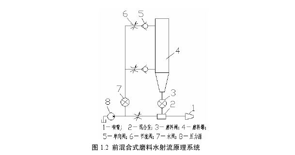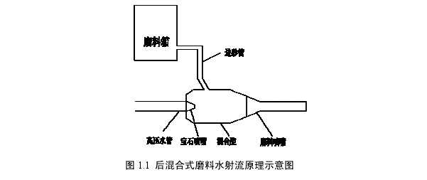 后混合式磨料水射流工作原理,如图 1.1 所示,利用液压系统把水压增加到 200MPa-400MPa,使高压水通过一个水喷嘴(直径为 0.076mm- 0.6mm),形成 2-3 倍音速的高速水射流,使水压能转变为射流动能,当水射流以超音速的速度经过混砂室时,导致混合室内形成局部真空,磨料在大气压和重力作用下由进砂口进入混砂室,磨料与水射流混合进入混砂管形成磨料水射流。在高压磨料水射流中水作为载体使磨料粒子加速,由于磨料粒子比重大,硬度高,较之纯水射流具有更强的冲蚀去除材料的能力。前混合式磨料水射流的工作原理如图 1.2 所示[5]。