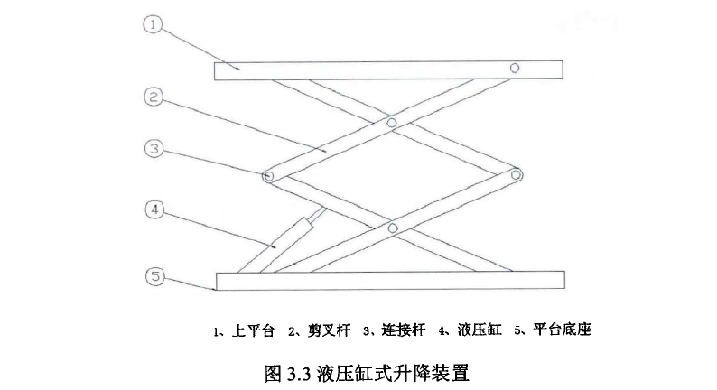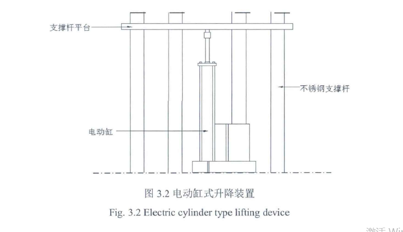 根据待清洗臂架结构、清洗装置的工作环境以及超高压水射流的清洗特点,对清洗装置升降平台机构进行结构性设计。针对清洗装置的支撑平台升降功能的实现,提出两种方案,第一种方案如图3.2所示。清洗装置在竖直方向上的运动是通过同步带式电动缸的伸缩来实现。支撑平台通过四个套筒固定在水平面上,电动伸缩杆推动支撑平台做上下调节,从而实现升降功能。此方案不但能保证工作的效率还使得控制非常精确。第二种方案如图3.3所示。升降装置采用剪叉式结构,滚轮经过凸轮驱动升降平台做匀速升降运动,通过操作手柄对液压缸压力的控制实现升降平台清洗装置高度的调整,使清洗盘与待清洗表面达到同一水平面。因大型工程机械设备一般有多种样式和型号,臂架安装固定在臂架夹持机构上最高可达700mm,电动缸式方案虽然调节速度较快且较为精准,但电动缸由于自身高度过高,安装不便且运行的平稳性与承载能力都不如剪叉式液压升降平台,对比分析上述两种方案,液压缸式方案更加适合。