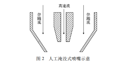 为了产生高效的空化水射流,许多学者开始研究产生空化的条件。1988 年,Song[35]对水流中的空化现象进行了模拟,总结出空化发生的条件。后来人们发现喷嘴的结构形状与水射流空化的产生密不可分,于是国内外学者设计了各种各样的空化喷嘴,总体分为绕流型空化喷嘴、自激振荡式空化喷嘴和角形空化喷嘴。另外,在淹没条件下高压水射流极易形成空化射流。目前空化水射流主要应用于淹没环境,非淹没环境的应用尚处开发探索阶段。为营造淹没环境,提高水射流空化率,进而提高除锈效率,研发了人工淹没水射流技术。Conn 等[36]提出了人工淹没的设计方案,即采用伴随低压射流的方法,高速射流与低速射流形成剪切力诱发空化发生,空化效果十分明显( 见图 2) 。张明松等[37]设计了一种空化喷嘴,利用有限元分析软件和试验对所设计的空化喷嘴进行流体场分析,发现空化喷嘴比普通喷嘴的清洗能力大很多。康灿等[38]研究了非淹没式中心体空化喷嘴的结构对清洗效率的影响,发现中心体的相对直径越大,清洗效率越高。王萍辉等[39]等在理论分析自激振动空化喷嘴的基础上,设计了不同尺寸组合的风琴管空化喷嘴,通过对射流喷射时喷嘴及射靶振动信号的比较分析,发现了风琴管空化喷嘴的主要结构参数( 喷嘴直径、谐振腔长) 对喷嘴产生自激振动空化效果的影响规律,从而为自激振动空化喷嘴的优化提供了有效办法,提高了喷嘴的空化效率。