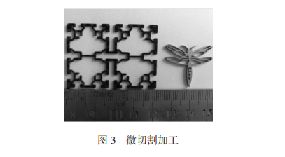 微切割是在水切割工艺基础上的又一派生,它专门针对薄板材料、复合材料和稀贵金属材料的精细加工,强调切缝趋于零(即切割后的组合尺寸与切割前无大变化)和超高精度加工,尤其对锐角、窄边和复杂图案的切割。微切割的工作量不大,也没有切割速度要求,但要想很好的完成微切割加工,针对不同材料有以下 2 种工艺路线:(1)精细磨料射流,即在高端超高压射流基础上,采用 150 目以上的精细磨料,射流喷嘴和流量都将进一步降低;(2)纯水射流,即在 450 MPa 甚至更高的超高压射流基础上,采用纯水射流以 3 倍以上超音速射流作业。微切割的精度目标:磨料射流复现性精度±0.01 mm;纯水射流线性精度 ±0.067 mm/min,切割速度 10000 mm/min。图 3 所示为微切割加工实例。