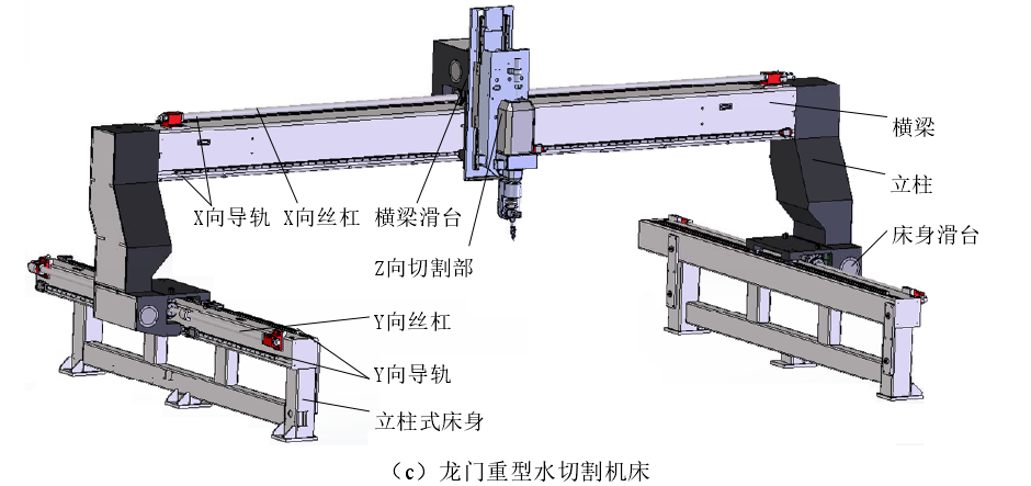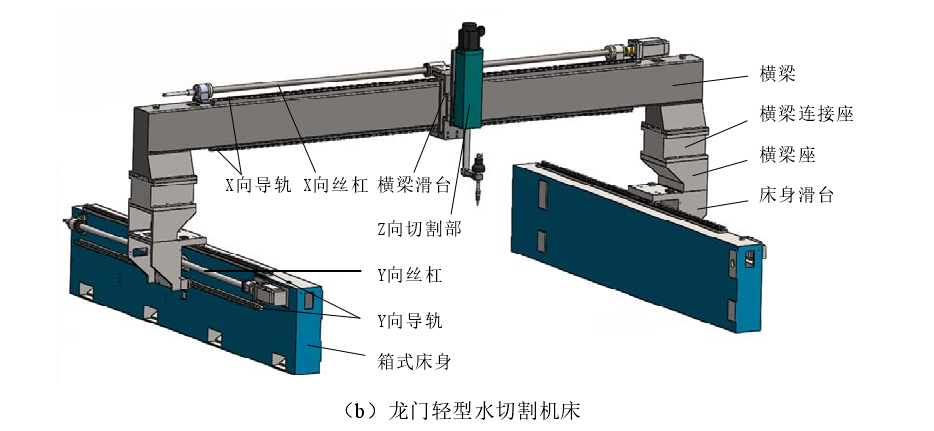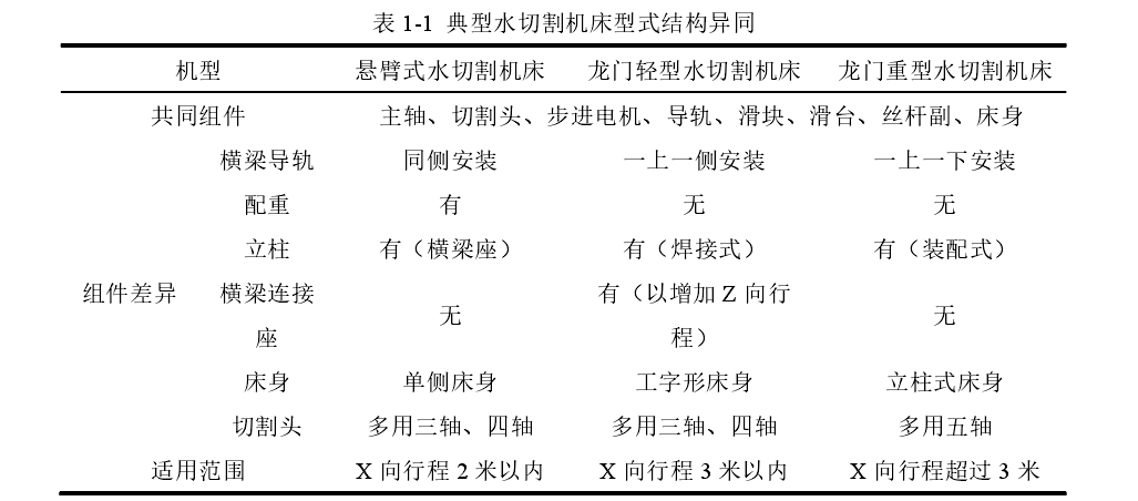 这三种基本型式有其对应的选择标准,如切割对象大小、行程长短、精度等级、价位等都是决定型式选择的要素。水切割机床的主要部件基本相同,均是由横梁、主轴、切割头、步进电机、导轨、滑块、滑台、丝杆副、立柱、床身等组成,只是一些部件的结构不同,立柱在龙门式水切割机床中使用,而且结构及装配形式也不相同:龙门轻型是将立柱焊接在横梁下方当作一个部件;龙门重型则将立柱作为单独组件,通过螺钉螺母装配在横梁两端;悬臂式中的横梁座,起到支撑横梁在床身上滑动的作用,可将其看作立柱。由于悬臂式水切割机床的悬臂结构,为防止变形过大,需要在悬臂梁固定端加上配重。导轨的安装方式、床身的结构也各不相同,但均是通过地脚螺栓固定在地面上,详细异同点见表1-1。水切割机床的坐标系沿横梁上丝杆方向为X向,沿床身上丝杆方向为Y向,竖直方向为Z向。