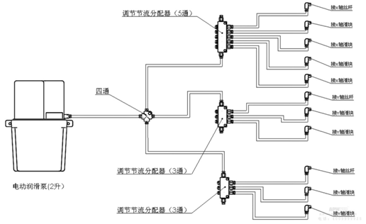 上面的图是润滑系统的示意图。从图中可以看出,当自动启动活塞泵时润滑油便注入各个润滑点,从而起到润滑和保养的作用。润滑油的润滑时间和间隔通过润滑泵面板进行调节和设定,润滑油流量的大小可以通过节流分配器进行调节,滤油器随时对润滑剂进行过滤,确保了润滑剂的清洁干净。